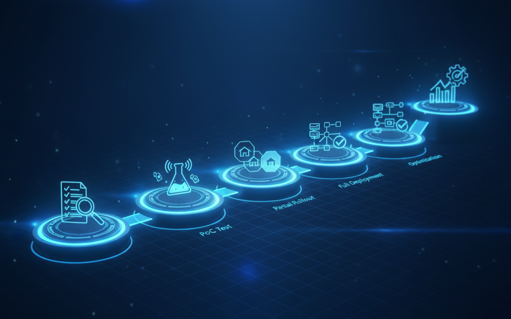 RFID導入では、要件定義からPoC(小規模検証)、部分導入、本番導入へと段階的に進めることで、現場とのギャップを減らしながら確実に運用へ移行できます。